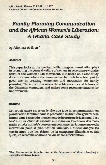 This paper looks at the role Family Planning communication plays in promoting the general welfare of women, in accordance with the spirit of the Women's Lib movement. It is based on a case study done in Ghana, where the mass media channels have been put to good use in creating awareness and motivation for family planning. The author discusses the achievements and failures of the Ghanaian campaign, and makes some recommendations for improvement.