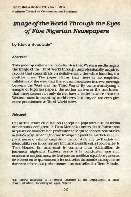 This paper questions the popular view that Western media negate the image of the Third World through unprofessionally acquired reports that concentrate on negative activities while ignoring the positive ones. The paper claims that there is no empirical validation of the view that there is an imbalance in news coverage between the West and the Third World. By content-analysing a sample of Nigerian papers, the author arrives at the conclusion that these papers not only do not have a better balance than the Western ones in reporting world news, but they do not even give more prominence to Third World news.