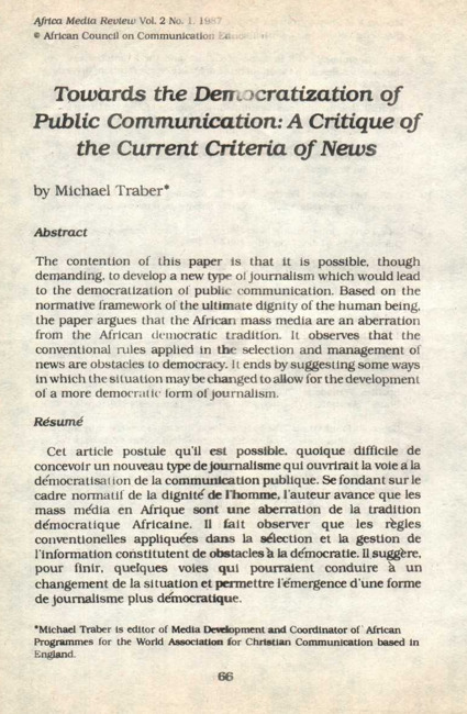 The contention of this paper is that it is possible, though demanding, to develop a new type of journalism which would lead to the democratization of public communication. Based on the normative framework of the ultimate dignity of the human being, the paper argues that the African mass media are an aberration from the African democratic tradition. It observes that the conventional rules applied in the selection and management of news are obstacles to democracy. It ends by suggesting some ways in which the situation may be changed to allow for the development of a more democratic form of journalism.