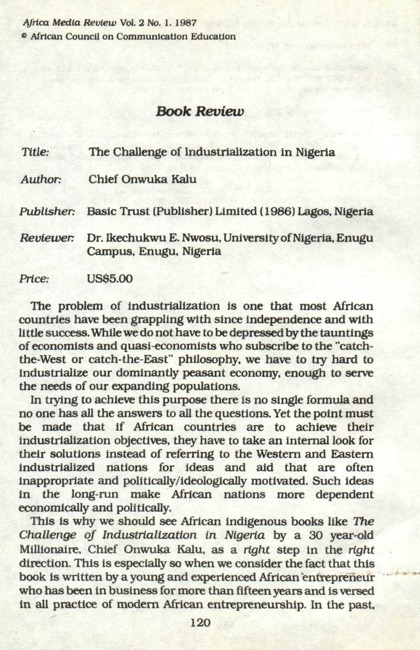 Book review : The challenge of industrialization in Nigeria. By Chief Onwuka Kalu. Lagos, Nigeria, Basic Trust (Publisher) Limited, 1986