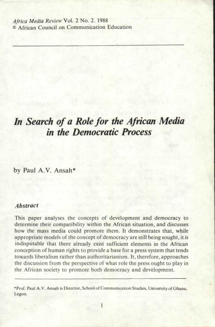 This paper analyses the concepts of development and democracy to determine their compatibility within the African situation, and discusses how the mass media could promote them. It demonstrates that, while appropriate models of the concept of democracy are still being sought, it is indisputable that there already exist sufficient elements in the African conception of human rights to provide a base for a press system that tends towards liberalism rather than authoritarianism. It, therefore, approaches the discussion from the perspective of what role the press ought to play in the African society to promote both democracy and development.