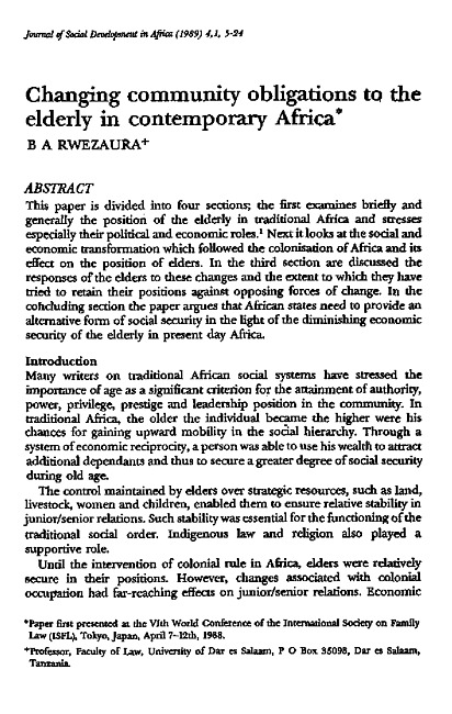 This paper is divided into four sections; the first examines briefly and generally the position of the elderly in traditional Africa and stresses especially their political and economic roles. Next it looks at the social and economic transformation which followed the colonisation of Africa and its effect on the position of elders. In the third section are discussed the responses of the elders to these changes and the extent to which they have tried to retain their positions against opposing forces of change. In the concluding section the paper argues that African states need to provide an alternative form of social security in the light of the diminishing economic security of the elderly in present day Africa.
