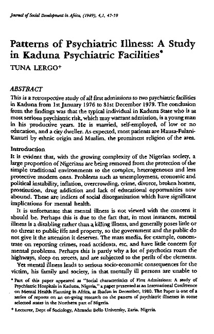 Patterns of psychiatric illness : a study in Kaduna psychiatric facilities