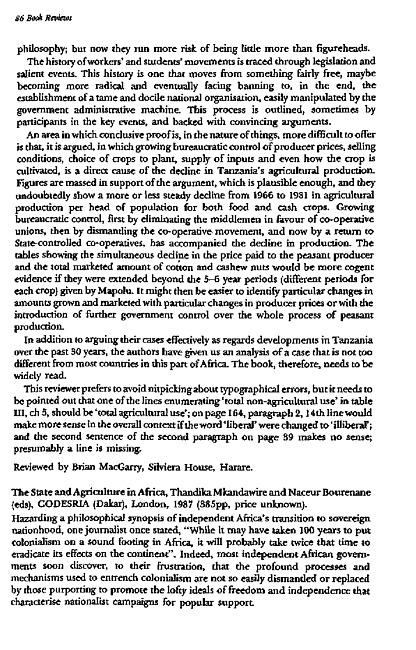 Review of: Thandika Mkandawire and Naceur Bourenane (eds.). The state and agriculture in Africa. Dakar: CODESRIA, 1987