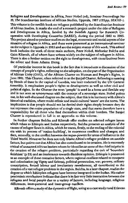 Review of: Peter Nobel (ed). Refugees and development in Africa. Uppsala: Scandinavian Institute of African Studies, 1987
