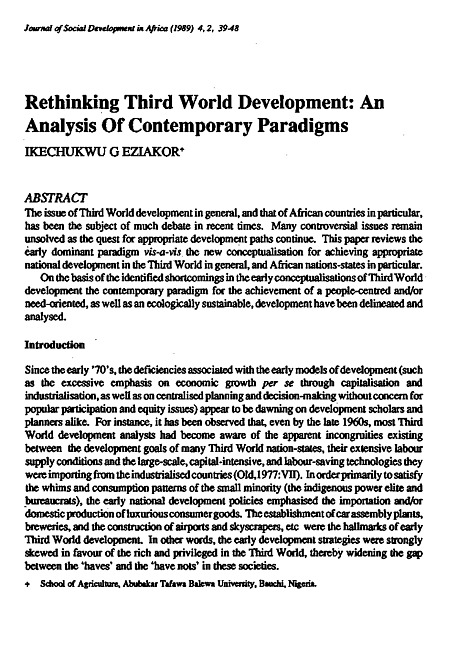 The issue of Third World development in general, and that of African countries in particular, has been the subject of much debate in recent times. Many controversial issues remain unsolved as the quest for appropriate development paths continue. This paper reviews the early dominant paradigm vis-a-vis the new conceptualisation for achieving appropriate national development in the Third World in general, and African nations-states in particular. On the basis of the identified shortcomings in the early conceptualisations of Third World development the contemporary paradigm for the achievement of a people-centred and/or need-oriented, as well as an ecologically sustainable, development have been delineated and analysed.