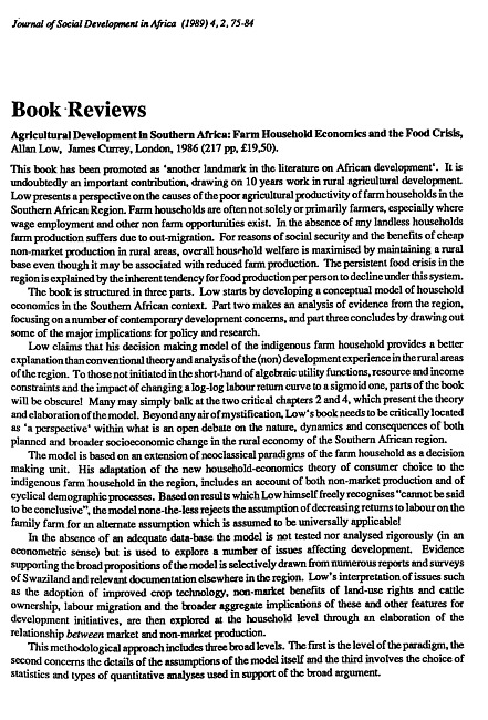 Review of: Allan Low. Agricultural development in Southern Africa. London: James Currey, 1986