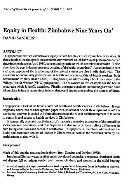 This paper summarises Zimbabwe's legacy in both health (or disease) and health services. It then examines the changes in the economic environment which have taken place in Zimbabwe since independence in April 1980, concentrating on those which are relevant to health. It also describes the post independence restructuring of the health sector itself. Access to health care and some aspects of the functioning of the referral system are also briefly dealt with. The questions of community participation in health and accountability of health workers, both central to the Primary Health Care (PHQ approach, are addressed by a brief discussion of the Village Health Worker (VHW) programme. The relevance of this example for the health sector as a whole is briefly examined. Finally, the paper considers some changes which have taken place in health status since independence and attempts to analyse the sources of these.