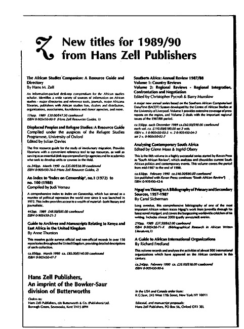 Advertisement about new titles for 1989/90 from Hans Zell Publishers