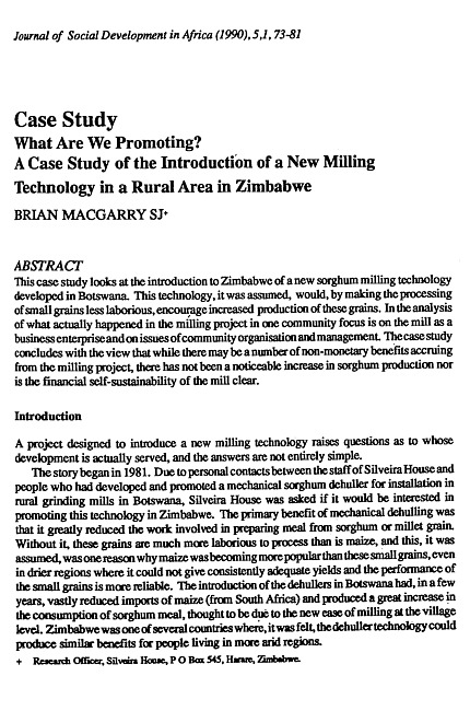 This case study looks at the introduction to Zimbabwe of a new sorghum milling technology developed in Botswana. This technology, it was assumed, would, by making the processing of small grains less laborious, encourage increased production of these grains. In the analysis of what actually happened in the milling project in one community focus is on the mill as a business enterprise and on issues of community organisation and management Thecase study concludes with the view that while there may be a number of non-monetary benefits accruing from the milling project, there has not been a noticeable increase in sorghum production nor is the financial self-sustainability of the mill clear.