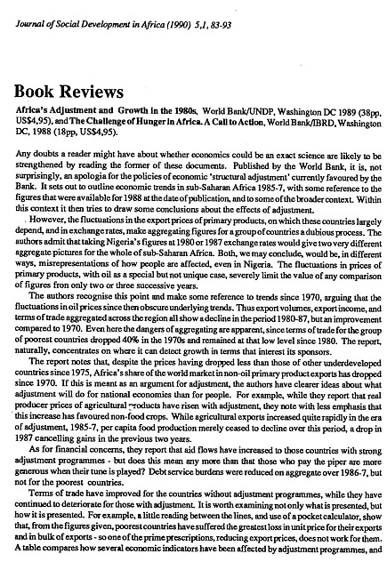 Reviews of: Africa's adjustment and growth in the 1980s. Washington DC: World Bank/UNDP, 1989, and The challenge of hunger in Africa. Washington DC: World Bank/IBRD, 1988