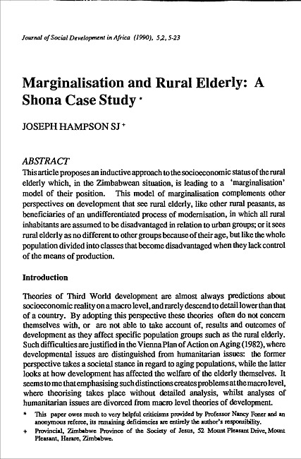 This article proposes an inductive approach to the socioeconomic status of the rural elderly which, in the Zimbabwean situation, is leading to a ‘marginalisation’ model of their position. This model of marginalisation complements other perspectives on development that see rural elderly, like other rural peasants, as beneficiaries of an undifferentiated process of modernisation, in which all rural inhabitants are assumed to be disadvantaged in relation to urban groups; or it sees rural elderly as no different to other groups because of their age, but like the whole population divided into classes that become disadvantaged when they lack control of the means of production.