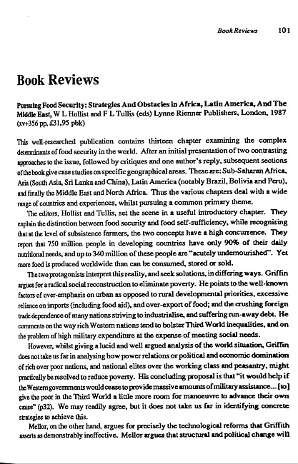 Review of: W.L. Hollist and F.L. Tullis (eds.). Pursuing food security. London: Lynne Rienner Publishers, 1987
