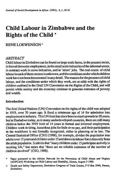 Child labour in Zimbabwe can be found on large scale farms, in the peasant sector, in formal domestic employment, in the small scale industries of the informal sector, in contract work in some industries, and in 'street' jobs. The real extent of child labour in each of these sectors is unknown, and the conditions under which children workhavenotbeen documented inany detail. The reasons for thepresence of child labour, and the conditions under which they work, are at odds with the rights of children outlined in the Draft UN Convention on the Rights of the Child, and will persist while society and the economy continue to generate extremes of poverty and wealth.