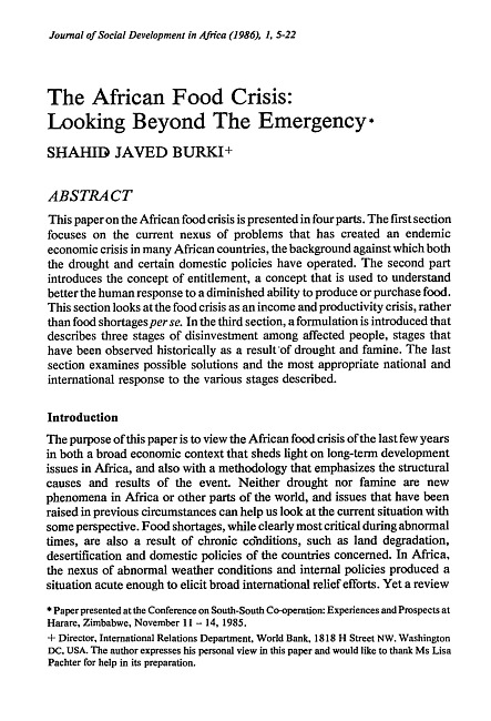 This paper on the African food crisis is presented in four parts. The first section focuses on the current nexus of problems that has created an endemic economic crisis in many African countries, the background against which both the drought and certain domestic policies have operated. The second part introduces the concept of entitlement, a concept that is used to understand better the human response to a diminished ability to produce or purchase food. This section looks at the food crisis as an income and productivity crisis, rather than food shortagesper se. In the third section, a formulation is introduced that describes three stages of disinvestment among affected people, stages that have been observed historically as a result of drought and famine. The last section examines possible solutions and the most appropriate national and international response to the various stages described.