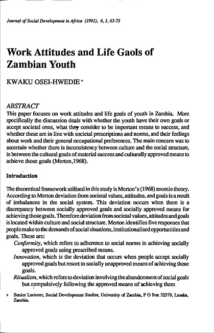 This paper focuses on work attitudes and life goals of youth in Zambia. More specifically the discussion deals with whether the youth have their own goals or accept societal ones, what they consider to be important means to success, and whether these are in line with societal prescriptions and norms, and their feelings about work and their general occupational preferences. The main concern was to ascertain whether there is inconsistency between culture and the social structure, ie between the cultural goals of material success and culturally approved means to achieve those goals.