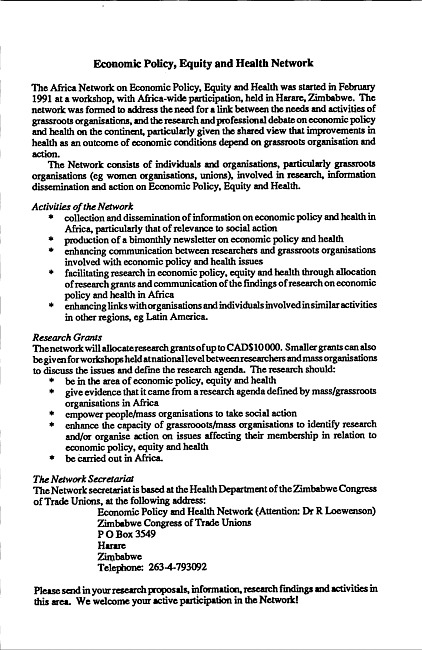 Advertisement for the Africa Network on Economic Policy, Equity and Health