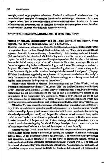 Review of: Robert Walgate. Miracle or menace? London: Panos Institute, 1990