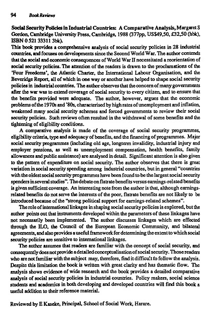 Review of: Margaret S. Gordon. Social security policies in industrial countries. Cambridge: Cambridge University Press, 1988