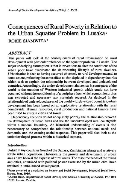 This paper will look at the consequences of rapid urbanisation on rural development with particular reference to the squatter problem in Lusaka. The major underlying assumption is that interventions to alter the conditions of the urban poor have excerbated the deteriorating lifestyle of rural dwellers. Urbanisation is seen as having occurred obversely to rural development and, to some extent, reflecting the same effect as that depicted in dependency theories which seek to explain the relationship between developed and undeveloped countries. Accordingly, the under-development that exists in some parts of the world is the creation of Western industrial growth which could not have occurred without the conditioning of a periphery from which economic surplus was extracted and necessary raw materials secured. As depicted in the relationship of undeveloped areas of the world with developed countries, urban development has been based on an exploitative relationship with the rural countryside. Human resources, rural production and national finance have been used to sustain cities and towns. Dependency theories do not adequately portray the relationship between the development of urban areas and the the underdeveloped rural countryside within a national boundary. An historical understanding of events is also nececessary to comprehend the relationship between national needs and demands, and the ensuing social response. This paper will also look at the underdeveloped process within a historical context.