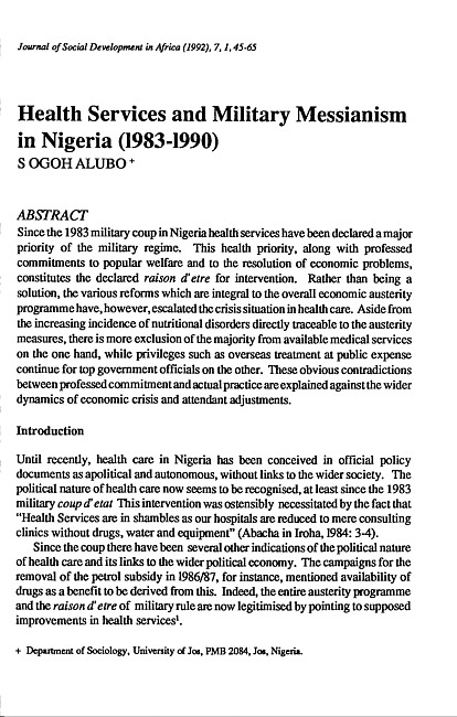 Since the 1983 military coup in Nigeria health services have been declared a major priority of the military regime. This health priority, along with professed commitments to popular welfare and to the resolution of economic problems, constitutes the declared raison d'etre for intervention. Rather than being a solution, the various reforms which are integral to the overall economic austerity programme have, however, escalated the crisis situation in health care. Aside from the increasing incidence of nutritional disorders directly traceable to the austerity measures, there is more exclusion of the majority from available medical services on the one hand, while privileges such as overseas treatment at public expense continue for top government officials on the other. These obvious contradictions between professed commitment and actual practice are explained against the wider dynamics of economic crisis and attendant adjustments.