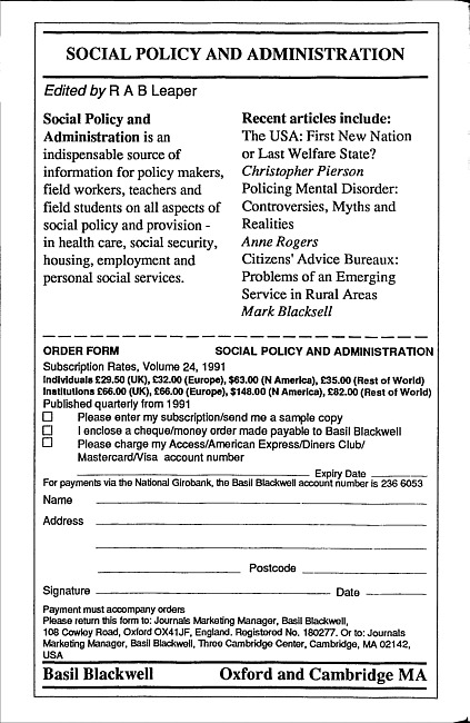Advertisement for the journal Social policy and administration