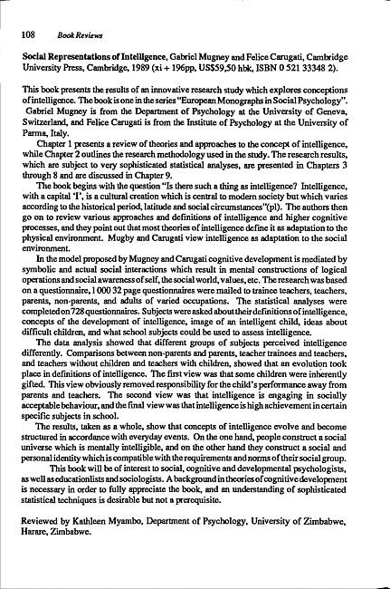 Review of: Gabriel Mugny and Felice Carugati. Social representations of intelligence. Cambridge: Cambridge University Press, 1989