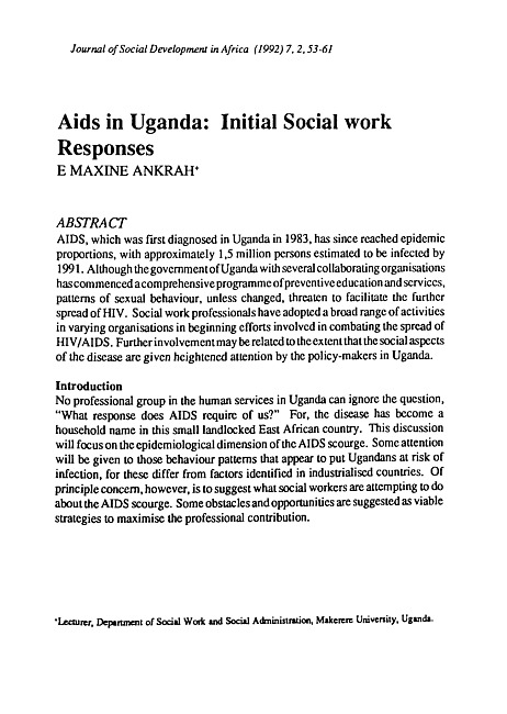 AIDS, which was first diagnosed in Uganda in 1983, has since reached epidemic proportions, with approximately 1,5 million persons estimated to be infected by 1991. Although the government of Uganda with several collaborating organisations has commenced a comprehensive programme of preventive education and services, patterns of sexual behaviour, unless changed, threaten to facilitate the further spread of HIV. Social work professionals have adopted a broad range of activities in varying organisations in beginning efforts involved in combating the spread of HIV/AIDS. Furtherinvolvementmay be related to the extentthat the social aspects of the disease are given heightened attention by the policy-makers in Uganda.