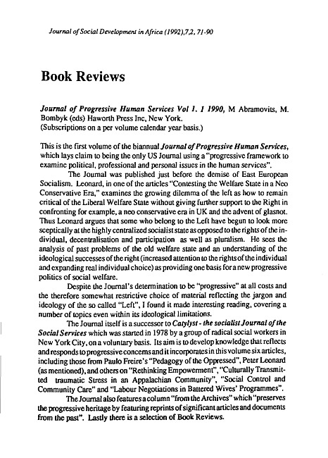 Review of: M. Abramovits, M. Bombyk (eds.). Journal of progressive human services, vo. 1 (1). New York: Haworth Press, 1990