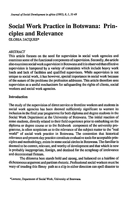 This article focuses on the need for supervision in social work agencies and examines some of the functional components of supervision. Secondly, the article also examines social work supervision in Botswana and it is observed that effective supervision is hampered by a variety of constraints which include heavy work loads and lack of facilities and qualified supervisors. While supervision is not unique to social work, it has however, special importance in social work because of the nature of the problems the profession addresses. This article therefore sees supervision as a useful mechanisam for safeguarding the rights of clients, social workers and social work agencies.