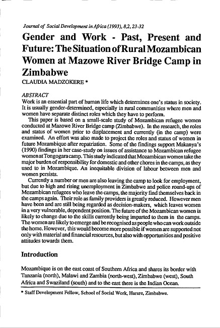 Work is an essential part of human life which determines one's status in society. It is usually gender-determined, especially in rural communities where men and women have separate distinct roles which they have to perform. This paper is based on a small-scale study of Mozambican refugee women conducted at Mazowe River Bridge camp (Zimbabwe). In the research, the roles and status of women prior to displacement and currently (in the camp) were examined. An effort was also made to project the roles and status of women in future Mozambique after repatriation. Some of the findings support Makanya's (1990) findings in her case-study on issues of assistance to Mozambican refugee women at Tongogara camp. This study indicated that Mozambican women take the major burden of responsibility for domestic and other chores in the camps, as they used to in Mozambique. An inequitable division of labour between men and women persists. Currently a number or men are also leaving the camp to look for employment, but due to high and rising unemployment in Zimbabwe and police round-ups of Mozambican refugees who leave the camps, the majority find themselves back in the camps again. Their role as family providers is greatly reduced. However men have been and are still being regarded as decision-makers, which leaves women in a very vulnerable, dependent position. The future of the Mozambican women is likely to change due to the skills currently being imparted to them in the camps. The women are likely to emerge and be recognised as people who can work outside the home. However, this would become more possible if women are supported not only with material and financial resources, but also with opportunities and positive attitudes towards them.