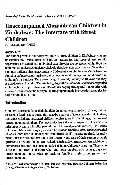 The author provides a descriptive study of street children in Zimbabwe who are unaccompanied Mozambicans. Both the reasons for and types of parent-child separations are examined. Individual case histories are presented to highlight the children's social, emotional, psychological andphysical experiences. The author's findings indicate that unaccompanied Mozambican children in Zimbabwe are found in refugee camps, urban centres, commercial farms, communal areas and children's institutions. They range in age from early infancy to 18 years and they are predominantly males. The article highlights the vulnerabilities of unaccompanied children, but also provides examples of their coping strategies. It concludes with concrete recommendations on policy and programmatic intervention strategies for this marginalised group.