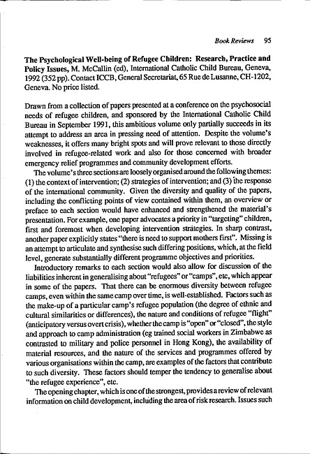 Review of: Margaret McCallin (ed). The psychological well-being of refugee children. Geneva: International Catholic Child Bureau, 1992