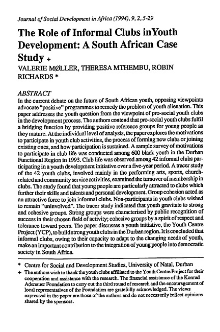 In the current debate cm the future of South African youth, opposing viewpoints advocate "positive" programmes to remedy the problem of youth alienation. This paper addresses the youth question from the viewpoint of pro-social youth clubs in the development process. The authors contend that pro-social youth clubs fulfil a bridging function by providing positive reference groups for young people as they mature. At the individual level of analysis, the paper explores the motivations to participate in youth club activities, the process of forming new clubs or joining existing ones, and how participation is sustained. A sample survey of motivations to participate in club life was conducted among 600 black youth in the Durban Functional Region in 1993. Club life was observed among 42 informal clubs participating in a youth development initiative over a five-year period. A tracer study of the 42 youth clubs, involved mainly in the performing arts, sports, church related and community service activities, examined the turnover of membership in clubs. The study found that young people are particularly attracted to clubs which further their skills and talents and personal development Group cohesion acted as an attractive force to join informal clubs. Non-participants in youth clubs wished to remain "uninvolved". The tracer study indicated that youth gravitate to strong and cohesive groups. Strong groups were characterised by public recognition of success in their chosen field of activity; cohesive groups by a spirit of respect and tolerance toward peers. The paper discusses a youth initiative, the Youth Centre Project (YCP), to build strong youth clubs in the Durban region. It is concluded that informal clubs, owing to their capacity to adapt to the changing needs of youth, make an important contribution to the integration of young people into democratic society in South Africa.