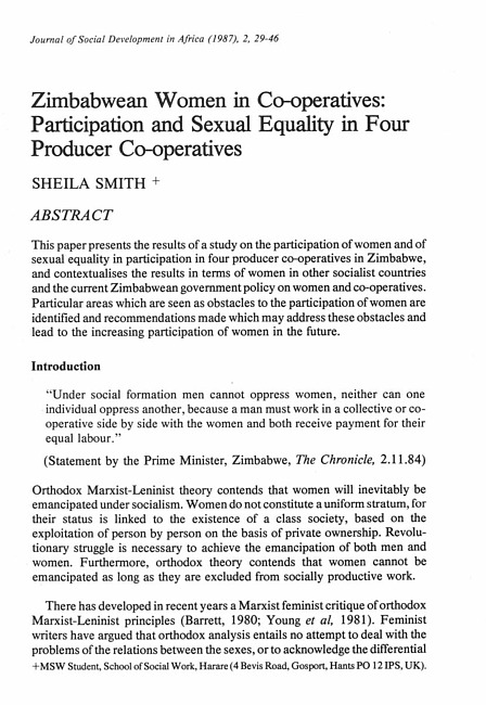 This paper presents the results of a study on the participation of women and of sexual equality in participation in four producer co-operatives in Zimbabwe, and contextualises the results in terms of women in other socialist countries and the current Zimbabwean government policy on women and co-operatives. Particular areas which are seen as obstacles to the participation of women are identified and recommendations made which may address these obstacles and lead to the increasing participation of women in the future.
