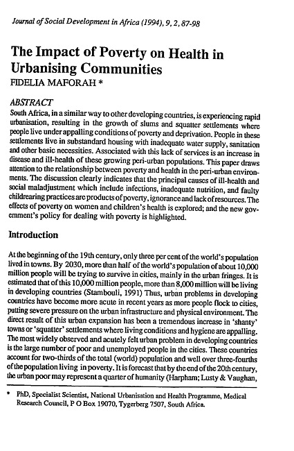 South Africa, in a similar way to other developing countries, is experiencing rapid urbanisation, resulting in the growth of slums and squatter settlements where people live under appalling conditions of poverty and deprivation. People in these settlements live in substandard housing with inadequate water supply, sanitation and other basic necessities. Associated with this lack of services is an increase in disease and ill-health of these growing peri-urban populations. This paper draws attention to the relationship between poverty and health in the peri-urban environments. The discussion clearly indicates that the principal causes of ill-health and social maladjustment which include infections, inadequate nutrition, and faulty childrearing practices are products of poverty, ignorance and lack of resources. The effects of poverty on women and children's health is explored; and the new government's policy for dealing with poverty is highlighted.