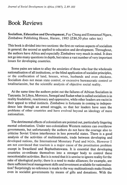 Review of: Fay Chung and Emmanuel Ngara. Socialism, education and development. Harare: Zimbabwe Publishing House, 1985