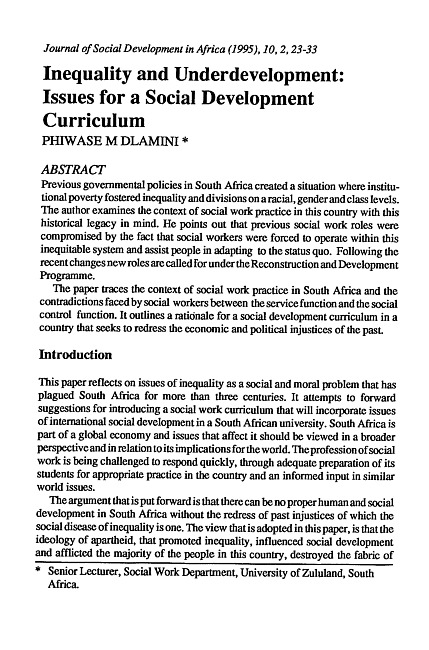 Previous governmental policies in South Africa created a situation where institutional poverty fostered inequality and divisions on a racial, gender and class levels. The author examines the context of social work practice in this country with this historical legacy in mind. He points out that previous social work roles were compromised by the fact that social wolkers were forced to operate within this inequitable system and assist people in adapting to the status quo. Following the recent changes new roles are called for under the Reconstruction and Development Programme. The paper traces the context of social wolk practice in South Africa and the contradictions faced by social workers between the service function and the social control function. It outlines a mtionale for a social development curriculum in a country that seeks to redress the economic and political injustices of the past