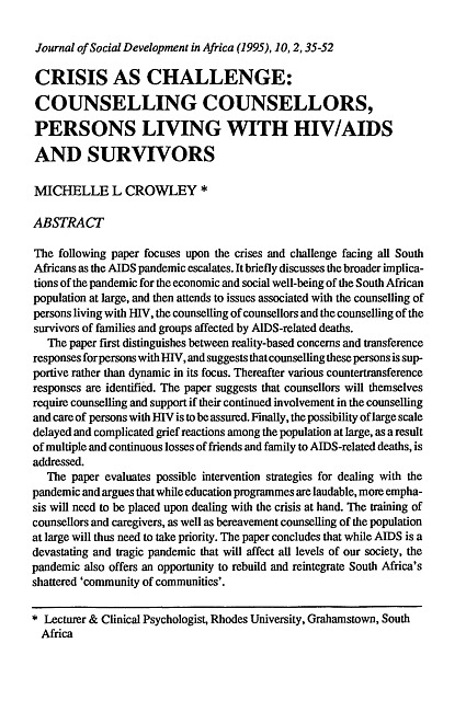 The following paper focuses upon the crises and challenge facing all South Mricans as the AIDS pandemic escalates. Itbriefly discusses the broader implications of the pandemic for the economic and social well-being of the South African population at large, and then attends to issues associated with the counselling of persons living with mv, the counselling of counsellors and the counselling of the survivors of families and groups affected by AIDS-related deaths. The paper first distinguishes between reality-based concerns and transference responses for persons with HN, and suggests that counselling these persons is supportive rather than dynamic in its focus. Thereafter various countertransference responses are identified. The paper suggests that counsellors will themselves require counselling and support if their continued involvement in the counselling and care of persons with mv is to be assured. Finally, the possibility of large scale delayed and complicated grief reactions among the population at large, as a result of multiple and continuous losses of friends and family to AIDS-related deaths, is addressed. The paper evaluates possible intervention strategies for dealing with the pandemic and argues that while education programmes are laudable, more emphasis will need to be placed upon dealing with the crisis at hand. The training of counsellors and caregivers, as well as bereavement counselling of the population at large will thus need to take priority. The paper concludes that while AIDS is a devastating and tragic pandemic that will affect all levels of our society, the pandemic also offers an opportunity to rebuild and reintegrate South Africa's shattered 'community of communities'.