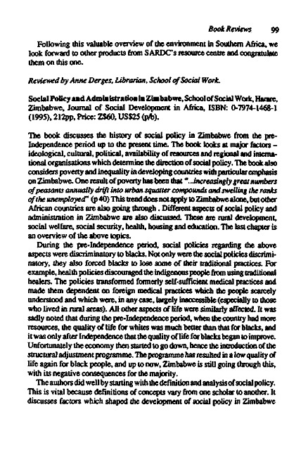 Review of: School of Social Work. Social policy and administration in Zimbabwe. Harare: Journal of social development in Africa, 1995