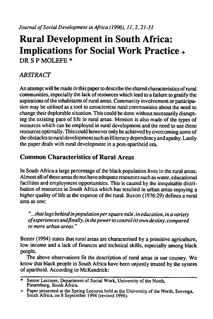 An attempt will be made in this paper to describe the shared characteristics of rural communities, especially the lack of resources which lead to a failure to gratify the aspirations of the inhabitants of rural areas. Community involvement or participation may be utilised as a tool to conscientise rural communities about the need to change their deplorable situation. This could be done without necessarily disrupting the existing pace of life in rural areas. Mention is also made of the types of resources which can be employed in rural development and the need to use these resources optimally. This could however only be achieved by overcoming some of the obstacles to rural development such as illiteracy dependency and apathy. Lastly the paper deals with rural development in a post-apartheid era.