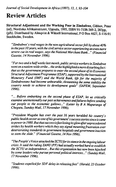 Review of: Peter Gibbons (ed). Structural adjustment and the working poor in Zimbabwe. Uppsala: Nordiska Afrikainstitutet, 1995