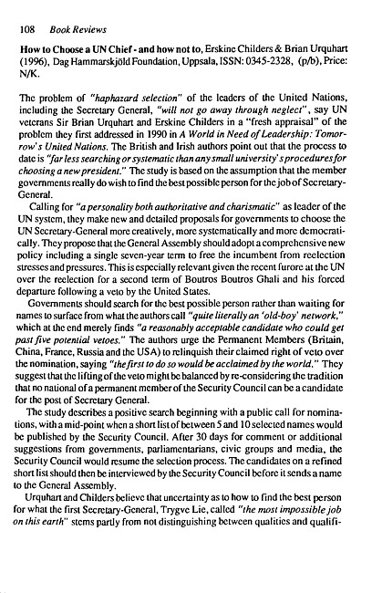 Review of: Erskine Childers & Brian Urquhart. How to choose a UN Chief - and how not to. Uppsala: Dag Hammarskjöld Foundation, 1996