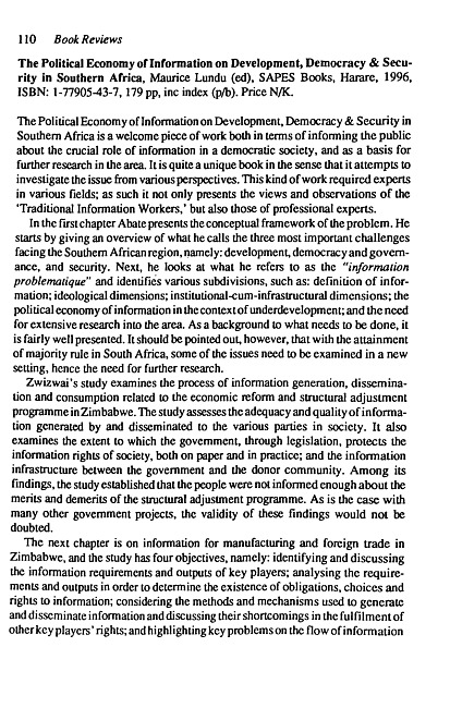 Review of: Maurice Chimfwembe Lundu (ed). Political economy of information on development, democracy and security in Southern Africa. Harare: SAPES Books, 1996