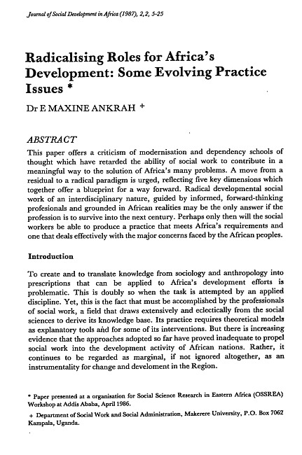 This paper offers a criticism of modernisation and dependency schools of thought which have retarded the ability of social work to contribute in a meaningful way to the solution of Africa's many problems. A move from a residual to a radical paradigm is urged, reflecting five key dimensions which together offer a blueprint for a way forward. Radical developmental social work of an interdisciplinary nature, guided by informed, forward-thinking profesionals and grounded in African realities may be the only answer if the profession is to survive into the next century. Perhaps only then will the social workers be able to produce a practice that meets Africa's requirements and one that deals effectively with the major concerns faced by the African peoples.