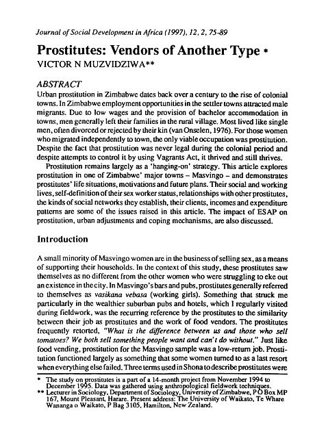 Urban prostitution in Zimbabwe dates back over a century to the rise of colonial towns. In Zimbabwe employment opportunities in the settler towns attracted male migrants. Due to low wages and the provision of bachelor accommodation in towns, men generally left their families in the rural village. Most lived like single men, often divorced or rejected by their kin (van Onselen, 1976). For those women who migrated independently to town, the only viable occupation was prostitution. Despite the fact that prostitution was never legal during the colonial period and despite attempts to control it by using Vagrants Act, it thrived and still thrives. Prostitution remains largely as a 'hanging-on' strategy. This article explores prostitution in one of Zimbabwe' major towns - Masvingo - and demonstrates prostitutes' life situations, motivations and future plans. Their social and working lives, self-definition of their sex worker status, relationships with other prostitutes, the kinds of social networks they establish, their clients, incomes and expenditure patterns are some of the issues raised in this article. The impact of ESAP on prostitution, urban adjustments and coping mechanisms, are also discussed.