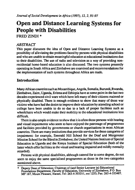 This paper discusses the idea of Open and Distance Learning Systems as a possibility of alleviating the problems faced by persons with physical disabilities and who are unable to obtain meaningful education at educational institutions due to their disabilities. The use of radio and television as a way of providing nonresidential home-based education is also discussed. The two systems presently operating in South Africa and Zimbabwe are examined and recommendations for the implementation of such systems throughout Africa are made.
