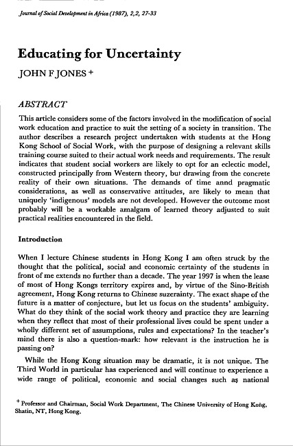 This article considers some of the factors involved in the modification of social work education and practice to suit the setting of a society in transition. The author describes a research project undertaken with students at the Hong Kong School of Social Work, with the purpose of designing a relevant skills training course suited to their actual work needs and requirements. The result indicates that student social workers are likely to opt for an eclectic model, constructed principally from Western theory, but drawing from the concrete reality of their own situations. The demands of time annd pragmatic considerations, as well as conservative attitudes, are likely to mean that uniquely 'indigenous' models are not developed. However the outcome most probably will be a workable amalgam of learned theory adjusted to suit practical realities encountered in the field.