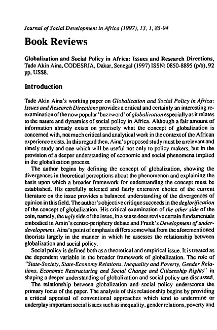 Review of: Tade Akin Aina. Globalization and social policy in Africa. Dakar, Senegal: Codesria, 1997
