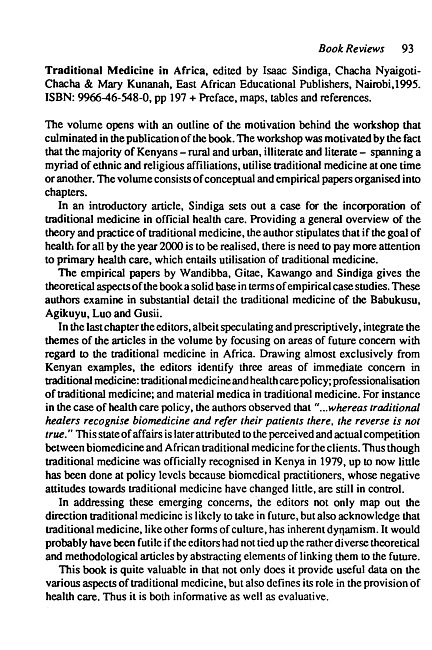 Review of: Isaac Sindiga, Chacha Nyaigotti-Chacha and Mary Peter Kanunah (eds.). Traditional medicine in Africa. Nairobi: East African Educational Publishers, 1995
